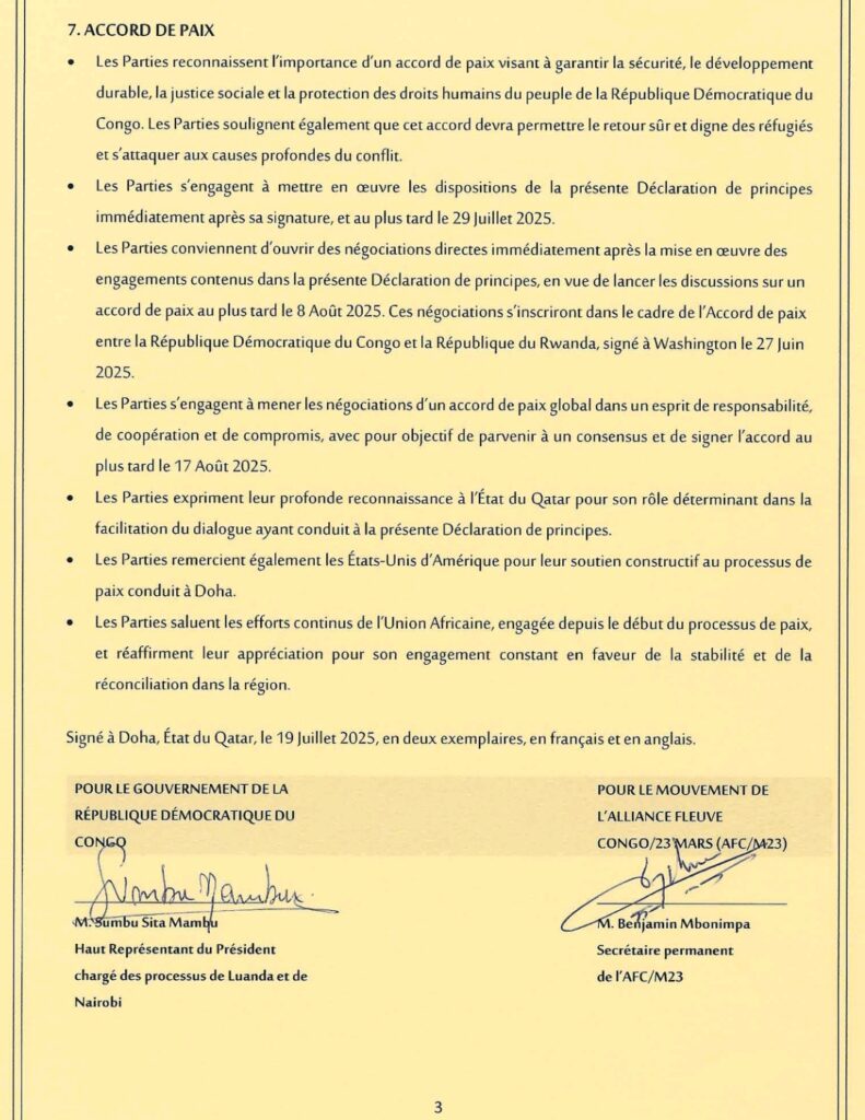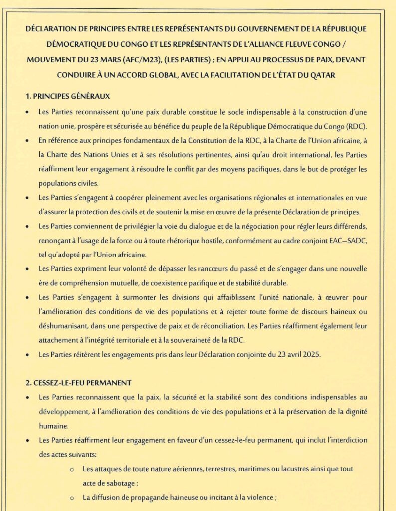 C’est une étape importante dans la quête de paix en République Démocratique du Congo. Le Gouvernement congolais et les représentants de l’Alliance Fleuve Congo / Mouvement du 23 Mars (AFC/M23) ont signé ce samedi à Doha, au Qatar, une Déclaration de principes visant à mettre un terme au conflit armé qui ravage l’Est de la RDC depuis plus d’une décennie. Cette initiative diplomatique, facilitée par l’État du Qatar avec le soutien des États-Unis, s’inscrit dans un processus de dialogue plus large et progressif, amorcé depuis plusieurs mois.