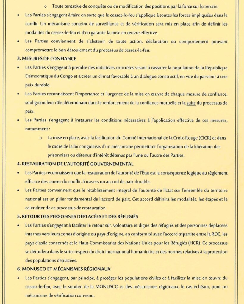 Le document signé affirme l’engagement des deux parties à résoudre le différend par des moyens pacifiques, en référence aux valeurs de la Constitution congolaise, à la Charte des Nations Unies, à celle de l’Union africaine ainsi qu’au droit international humanitaire. Les deux délégations ont convenu de renoncer à toute forme de violence, de conquête militaire ou de discours de haine, s’engageant à privilégier le dialogue et la négociation comme seules voies de règlement du conflit.